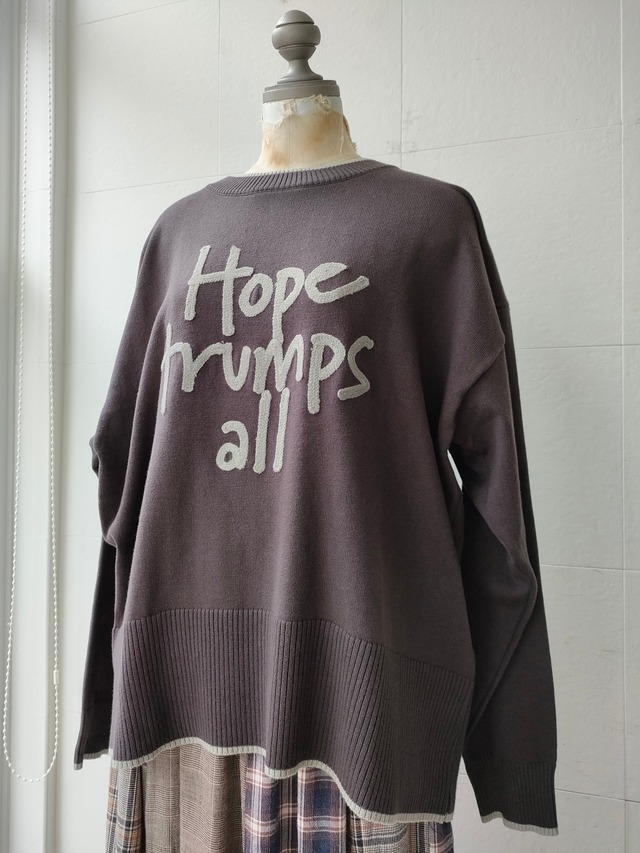 着丈:65/70cm 素材:綿80% ポリエステル20% カラー:CHARCOAL スウェットライクなニット ゆるシルエットでストレスフリー 「Hope trumps all」=希望がすべてに勝る